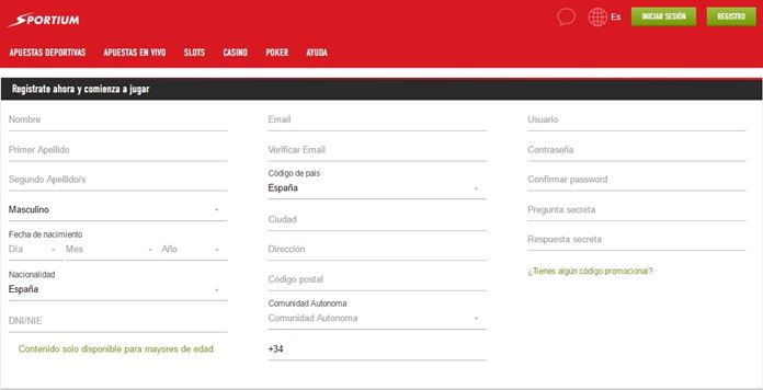 Abrir una cuenta en Sportium no requiere mucho tiempo. En la página web de Sportium encontraremos un botón de color verde que lleva inscrita la palabra “Regístrate”. Al pulsar sobre él, se abrirá el formulario de registro, a cumplimentar con los datos personales y de la cuenta que se va a crear. En cuanto confirmemos el registro estará disponible la cuenta para un primer ingreso.