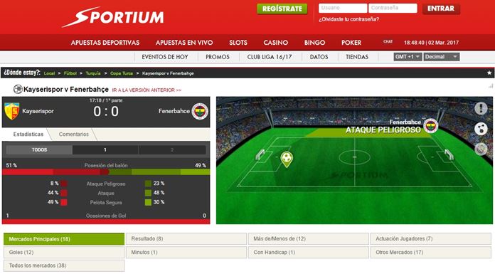 Sportium ha mejorado enormemente su sección dedicada a las apuestas live. En ella hay multitud de eventos para apostar en vivo de los más variados deportes. Sportium sigue proporcionado una completa información de los eventos a través de los marcadores, que recogen también estadísticas de otros datos a valorar a la hora de apostar. Además, la claridad del diseño facilita apostar con rapidez, algo clave en las apuestas en directo.